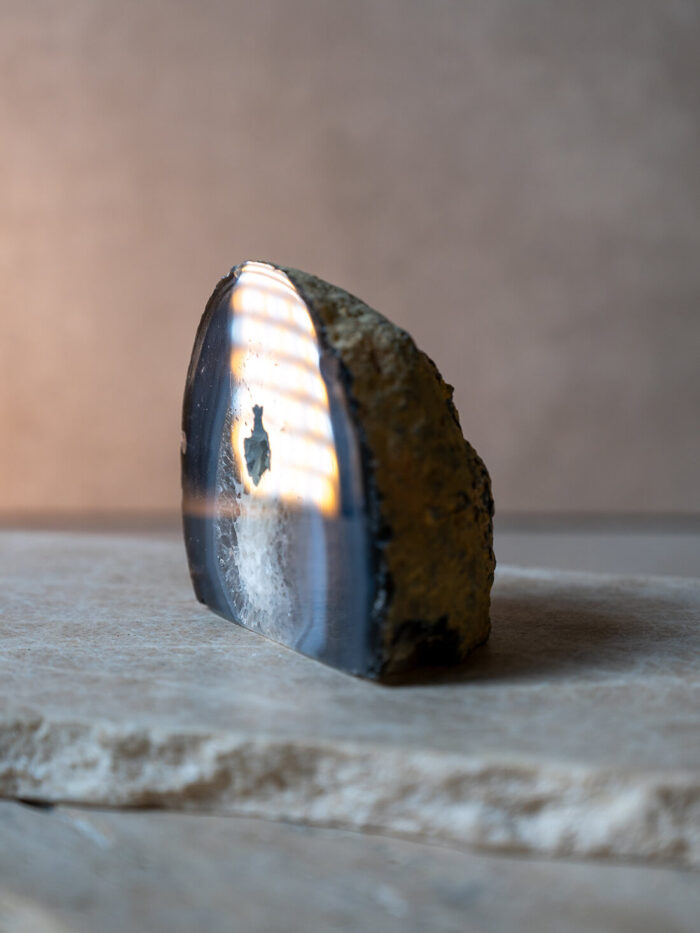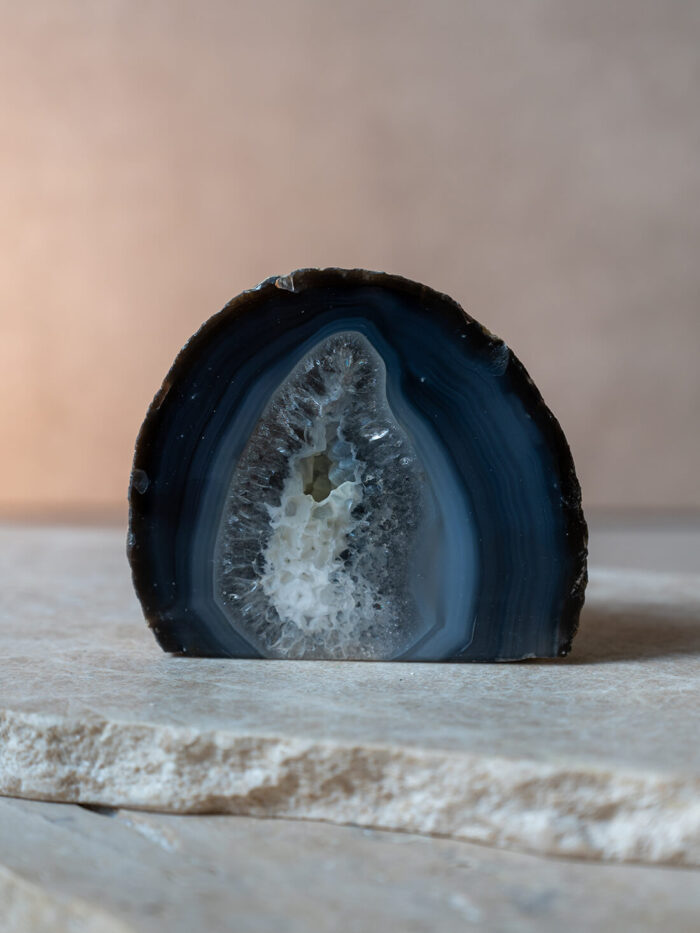 Surový kameň – minerál Celestín v podobe geódky. Každý kúsok je jedinečný svojim vzhľadom, sýtosťou farieb a odleskom. Ideálny ako dekorácia na stôl, poličku alebo pracovný priestor.